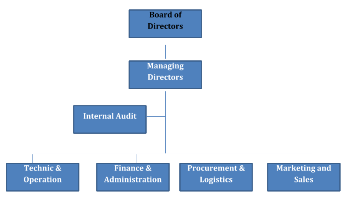 The top organ in the organizational structure is the Managing Director who will be assisted by the four division Heads. These Divisions are Administration & Finance, Technical & operation, procurement & logistics and marketing & sales. The managing director is responsible to lead, organize and coordinate the overall operation of the project. The Administration and Finance handle the accounts and personal activity of the organization.